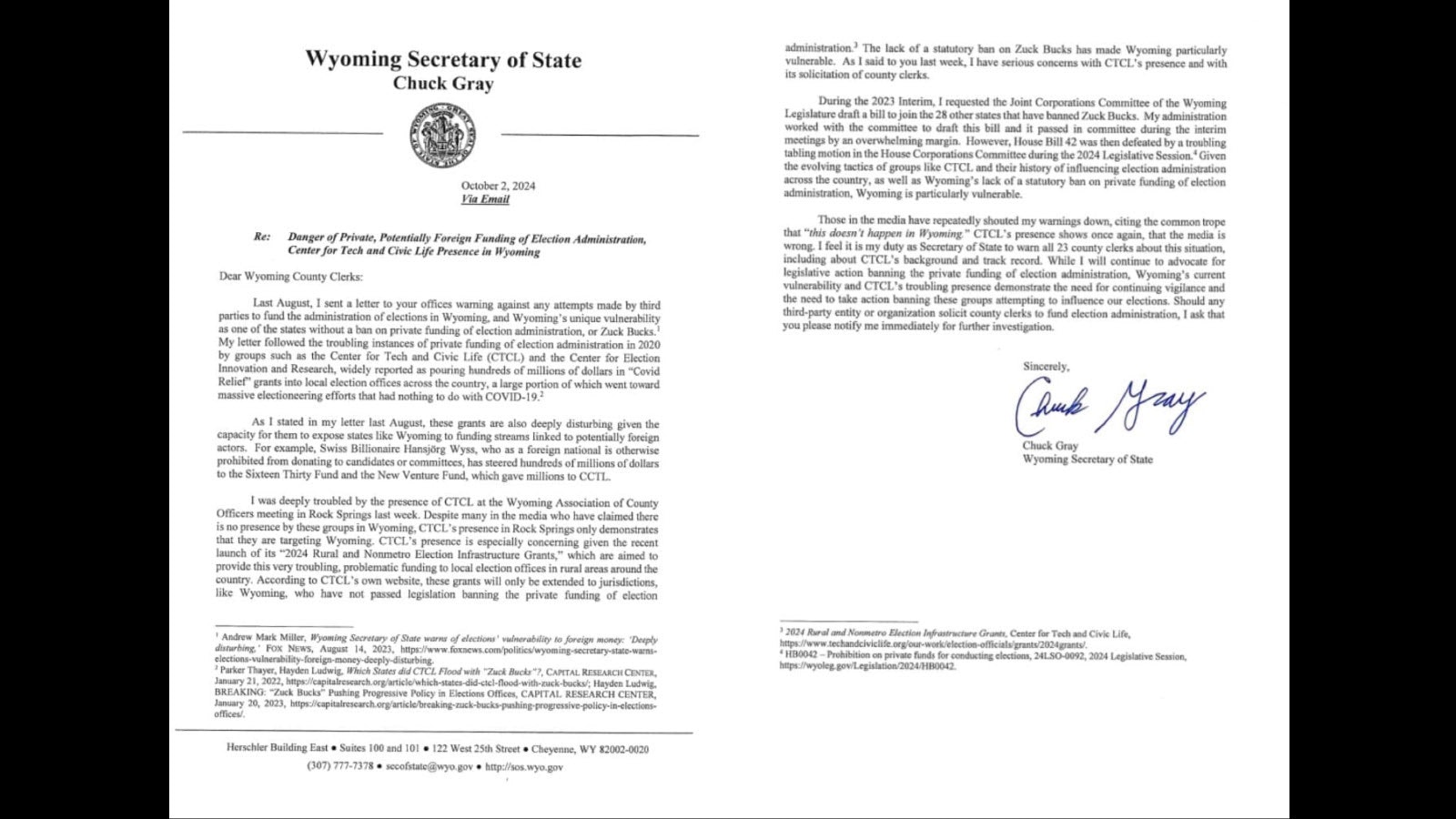 There is no evidence CTCL spent any money in Wyoming in 2020, but Gray urged the clerks in his letter to let him know if any private groups solicit them with money to run their elections, which is legal in Wyoming.